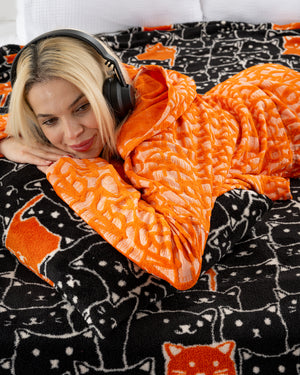 Yumuşak wellsoft dokusu ve eğlenceli tasarımıyla öne çıkan bu çift kişilik yorgan, siyah zemin üzerindeki kedi desenleri ve turuncu detayları ile yatak odanıza enerjik ve modern bir hava katar. Sevimli deseni sayesinde özellikle genç odaları ve dinamik dekorasyonlar için ideal bir tercihtir.
